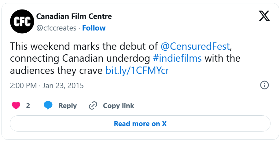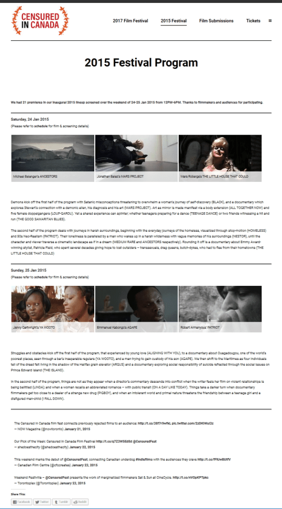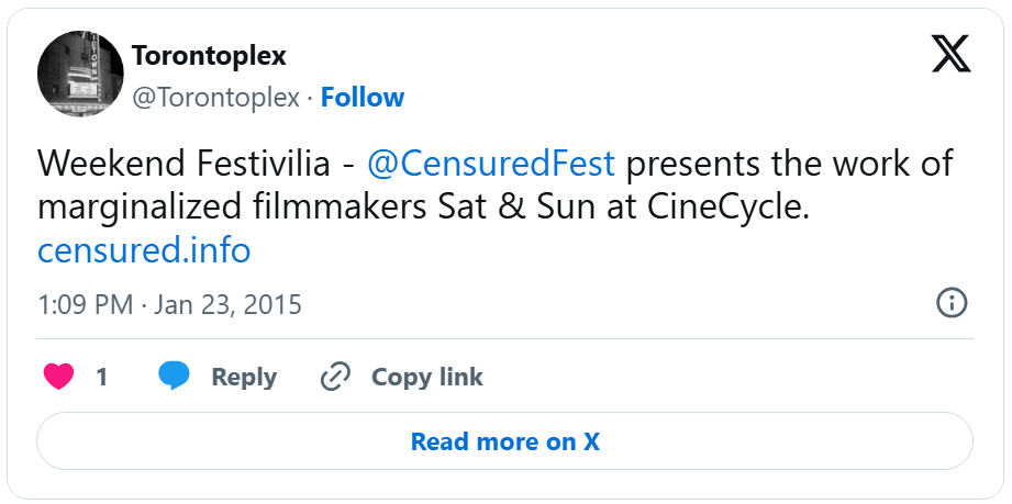 Film festivals typically revolve around pro forma aesthetics (typically white bourgeois) and splintered into niches and cliques (yet 40% of Canadian filmmakers did not attend arts/film school in Canada). The focus of CENSURED IN CANADA was around unique style and subject matter one won’t necessarily experience in other Canadian festivals; a platform to showcase diversity and works that won’t otherwise be seen (despite having premiered elsewhere). Inspired by the experiential aspects of vKunst Frankfurt and MIX NYC, the festival was based around a $10 day pass to enable audience accessibility and experimentation with familiar and unfamiliar genres and styles.