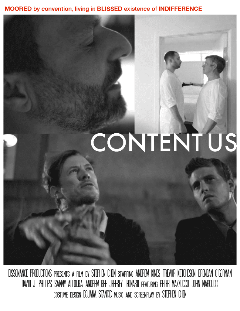 Eschewing contemporary conventions of narrative grammar, middle-aged and social crises intersect in the stories set respectively in a room, a condo, a meridian of a city where queer becomes allegory, and is de-eroticized; while an all-male cast subverts conventional relationship dynamics in the portrayals of power and vulnerability. Through rejecting the “wasted” shots in contemporary cinematography (redundant close ups, coverage angles, etc.) and utilizing music as a thematic counterpoint (vs. mood or editing device), CONTENTUS infuses cinema with Brechtian influences – in use of allegory, and where form itself is made conscious and interrogated (itself a metaphor for awakening the consciousness of people).