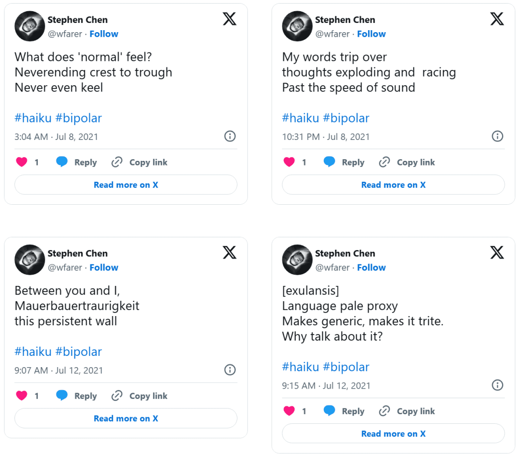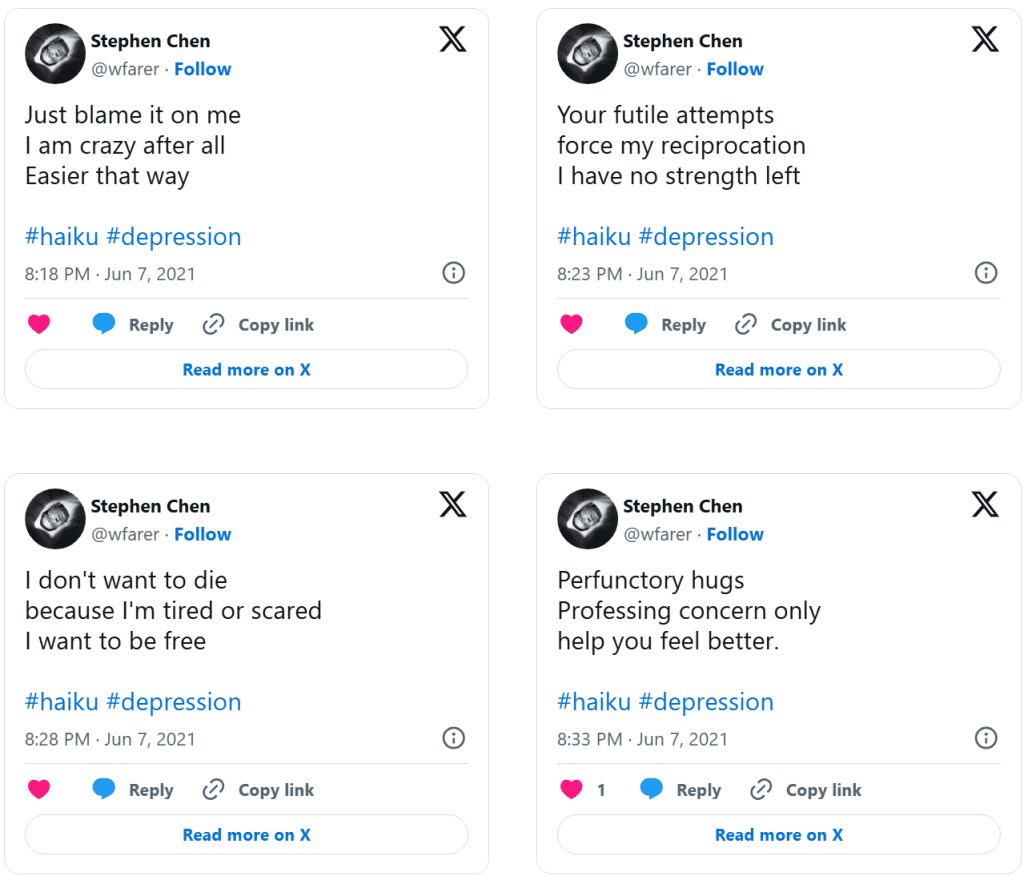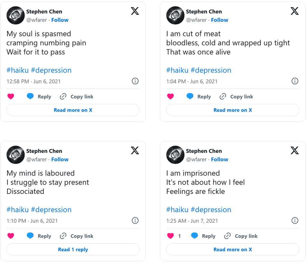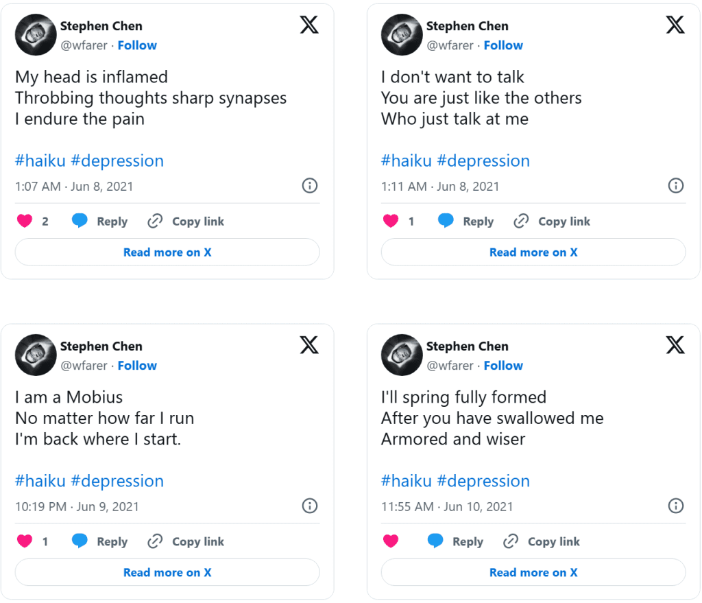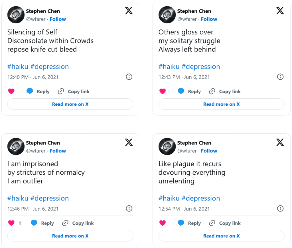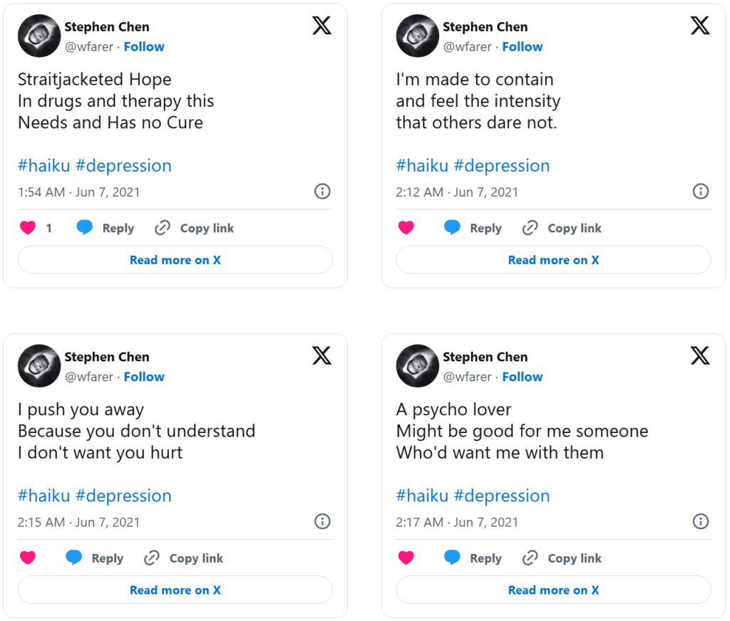 Dolor (Drained of Color) is a series of distilled emotional artifacts composed as haiku tweeted in real time during a clinical depression episode. Unlike retrospective reflection, Dolor exists in the raw immediacy of lived pain: terse syllables, stark imagery, and poetic fragments that resist elaboration because the experience itself was dissolving articulation. The work does not smooth suffering into narrative, nor does it seek aesthetic distance—it places the body of feeling directly into language that is brief, sharp, and unresolved.