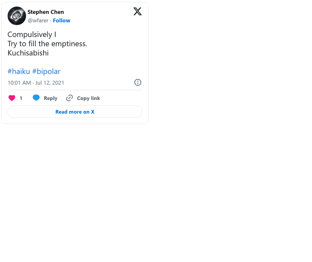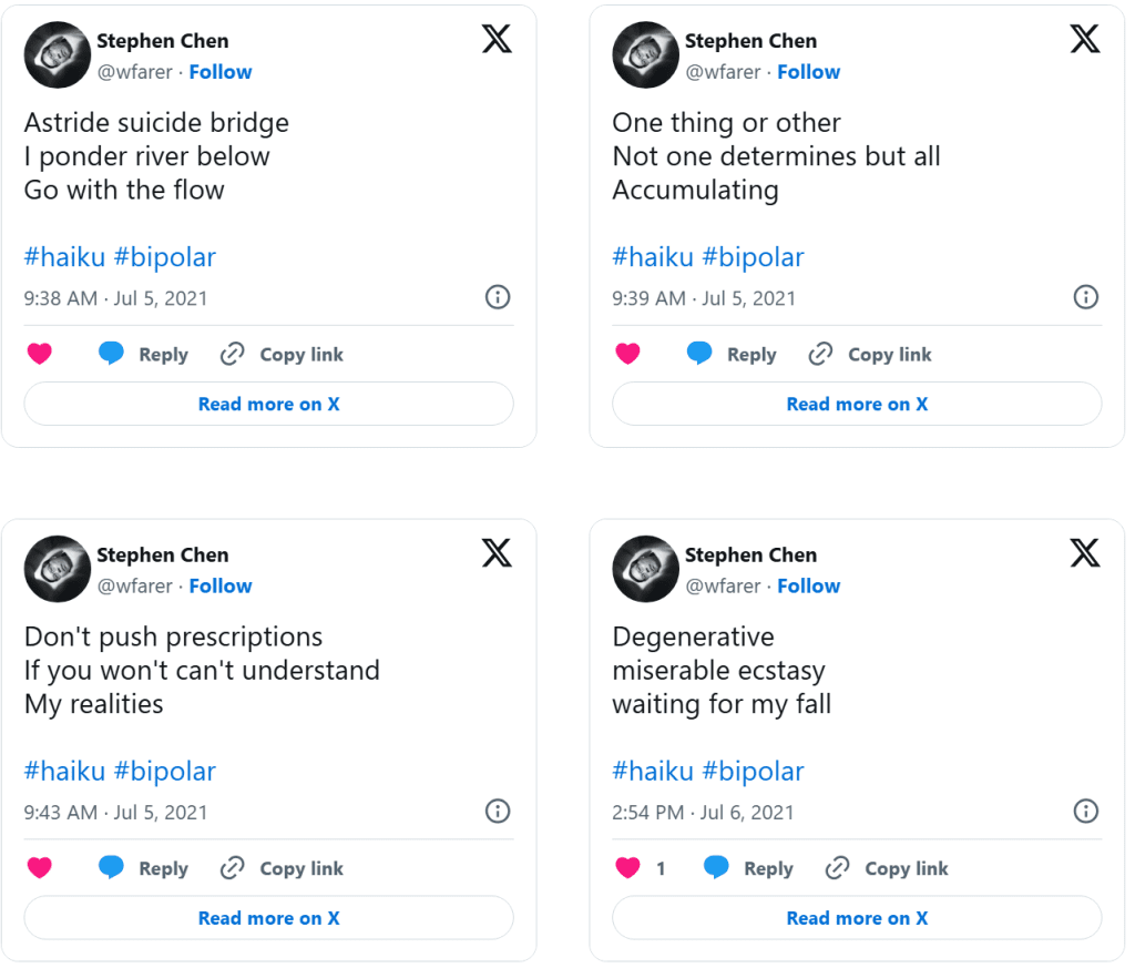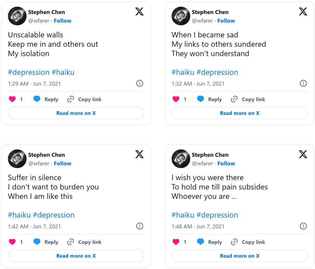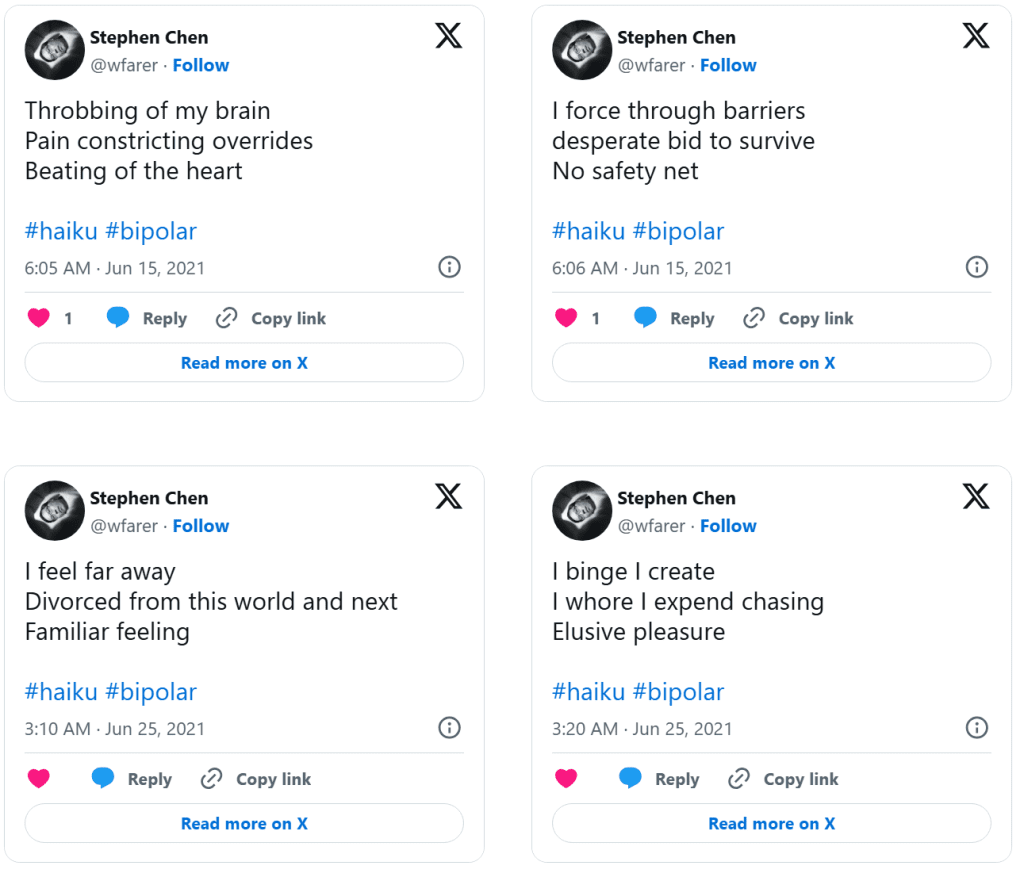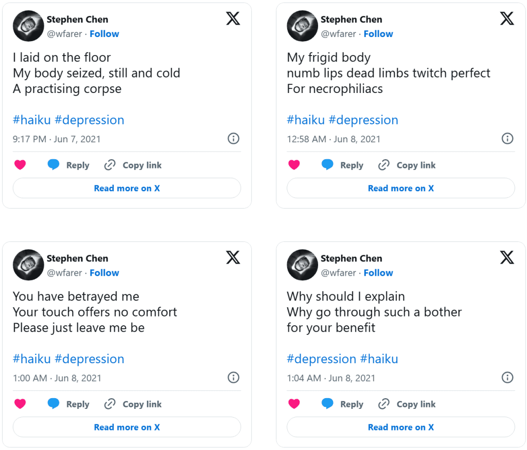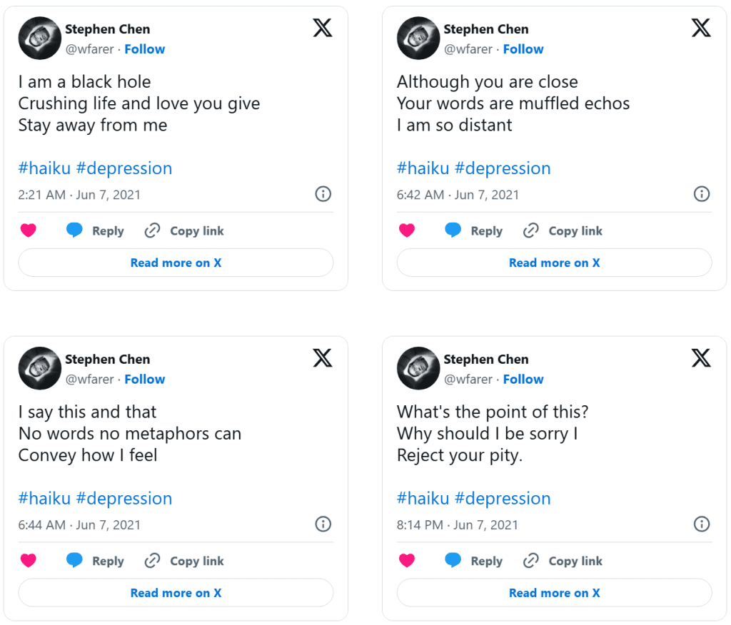 Dolor (Drained of Color) is a series of distilled emotional artifacts composed as haiku tweeted in real time during a clinical depression episode. Unlike retrospective reflection, Dolor exists in the raw immediacy of lived pain: terse syllables, stark imagery, and poetic fragments that resist elaboration because the experience itself was dissolving articulation. The work does not smooth suffering into narrative, nor does it seek aesthetic distance—it places the body of feeling directly into language that is brief, sharp, and unresolved.