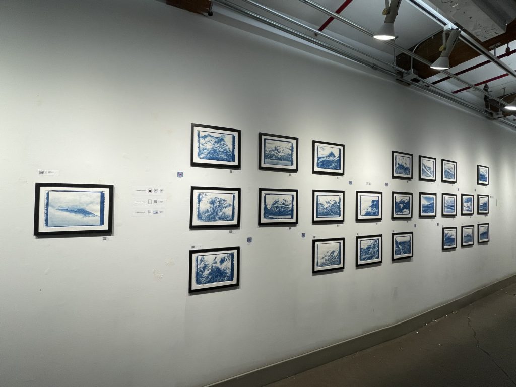 For the Sept 08 – Dec 09 2023 installation at Gallery 44’s Production Gallery, Stephen employs AR (Augmented Reality) using EyeJack as well as QR codes linking to music composed during the traverse to bring part of the experience of meditation and journey of loss to viewers. The cyanotype prints are exposed to reveal their rough, handmade nature representing the imperfect present that contrasts and interacts with the AR triggered when viewed through the EyeJack app; representing idealized expectations (hyperreal digital map flyovers), abstractions of experience (geo-located poetry written during the traverse), and remnant artifacts of the past (short unprocessed video clips).